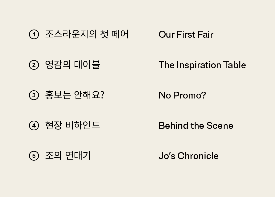 페어 참가가 결정될 즈음 머릿속에 떠오른 것은 JO’S TIMELINE 이라는 주제였습니다. 페어를 통해 (아마도) 조스라운지를 처음 접할 분들이 많다는 점에 더해, 2023년 겨울에 했던 JO’S TIMELINE 팝업에 대한 좋은 추억이 있어, ‘조의 연대기’라는 컨셉은 그대로 가져가되, 이전보다 확장된 모습을 보여드릴 수 있다면 어떨까 하는 목표가 있었습니다.
